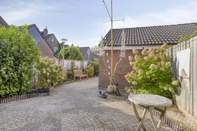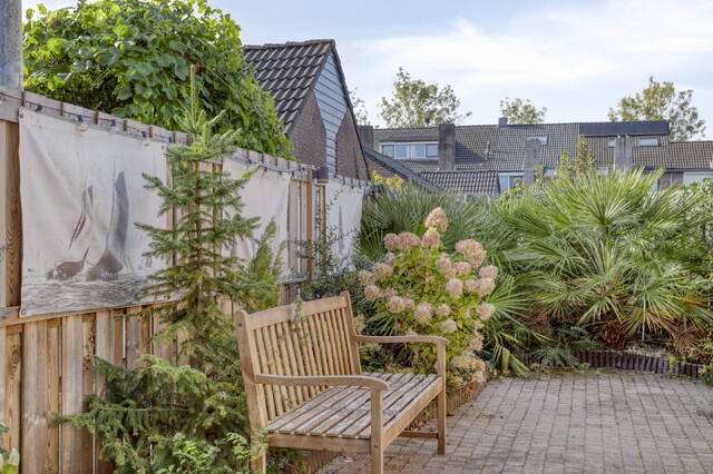 De achtertuin is gelegen op het zonnige zuidwesten en grenst aan een hof met vele parkeergelegenheid. De achtertuin beschikt over achterom, bestrating, beplanting, handmatig bedienbaar zonnescherm, buitenkraan en toegang tot de garage.