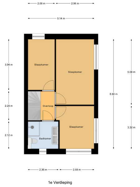 Via de vaste trap bereik je de overloop van de eerste verdieping. Hier treffen we een drietal ruime slaapkamers en de eerste moderne badkamer. De slaapkamers zijn respectievelijk 15, 9 en 8 m2 groot. De badkamer is uitgerust met een dubbele wastafel met wastafelmeubel, twee moderne mengkranen en een grote spiegel erboven met zowel een ingebouwde klok als verlichting. Daarnaast is er een grote inloopdouche, designradiator en een tweede toilet aanwezig. Een erg fijne, ruimtelijke badkamer.