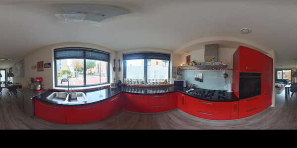 Terug in de woonkamer lopen we naar de voorzijde waar we de Bruynzeel keuken van 2017 in lopen. Het gezellige hart van de woning en een heerlijke ruime keuken waar je uren je gang kunt gaan om prachtige maaltjes te creëren. De keuken, rood uitgevoerd met een mooi natuurstenen keukenblad, is voorzien van diverse inbouwapparatuur zoals de koelkast, vriezer, vaatwasmachine, oven, 5-pits gaskookplaat met afzuigkap en een dubbele spoelbak met mengkraan. Door de vele ramen, zowel aan de voorzijde als de zijkant van de keuken, is het een heerlijk lichte keuken.