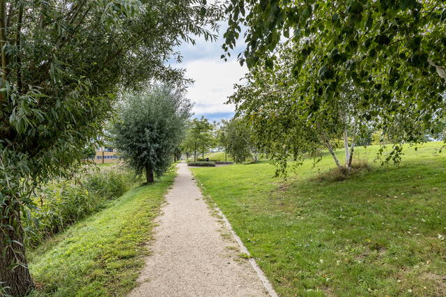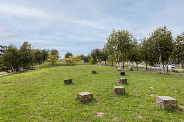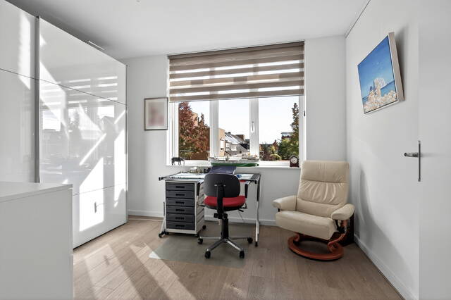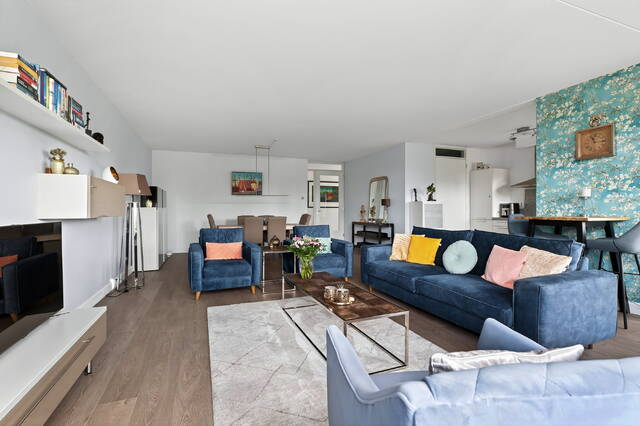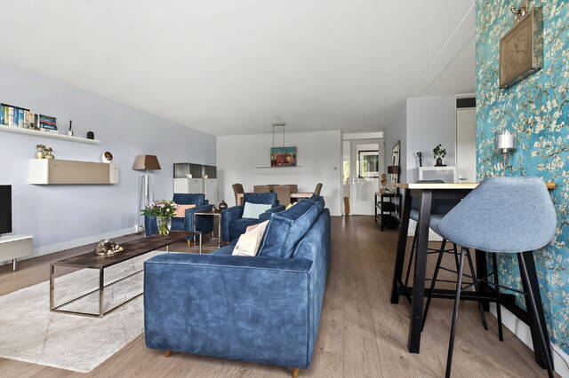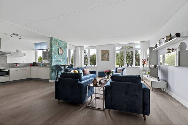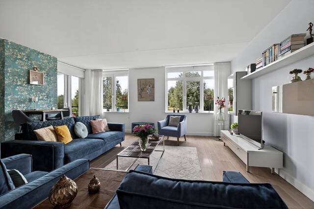 De woonkamer van circa vijftig vierkante meter is royaal van opzet en valt direct op door de grote ramen en de hoeveelheid licht die naar binnen stroomt. Dankzij de ligging op het westen geniet u hier in de middag en avond van prachtige lichtinval en een vrij uitzicht over het park. Via dubbele deuren heeft u toegang tot het ruime balkon van meer dan tien vierkante meter. Dit is een heerlijke plek om lange zomeravonden door te brengen met een drankje, of gewoon om te genieten van de rust en het uitzicht op het groen.