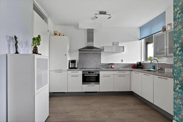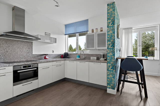 De woonkamer staat in open verbinding met de keuken van circa zeven vierkante meter. Deze is uitgevoerd in een hoekopstelling en voorzien van de gebruikelijke inbouwapparatuur. Het is een keuken die niet alleen praktisch is, maar ook uitnodigt om uitgebreid te koken. Vanuit het keukenraam kijkt u uit richting het balkon en het park, waardoor koken hier altijd een plezierige bezigheid is. Aangrenzend vindt u de praktische bijkeuken van ongeveer vijf vierkante meter, waar extra werk- en bergruimte aanwezig is. Hier bevinden zich tevens de cv-opstelling en aansluitingen voor wasmachine en droger, netjes uit het zicht maar altijd binnen handbereik.
