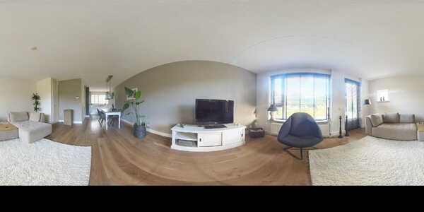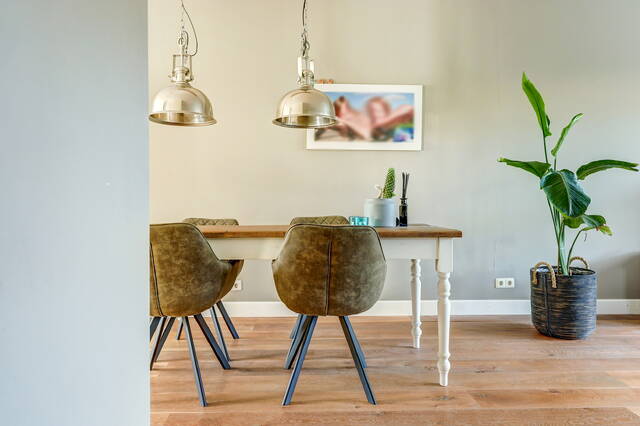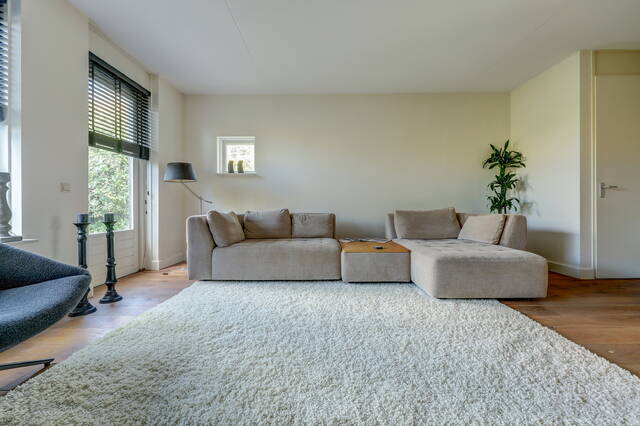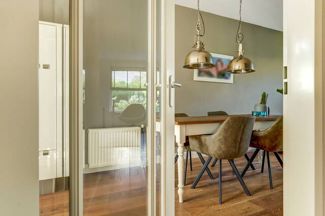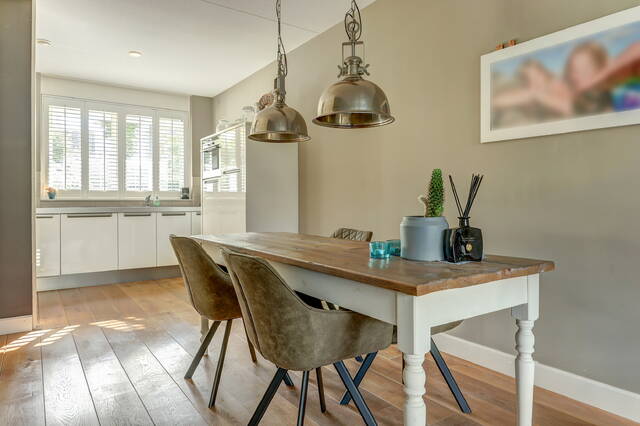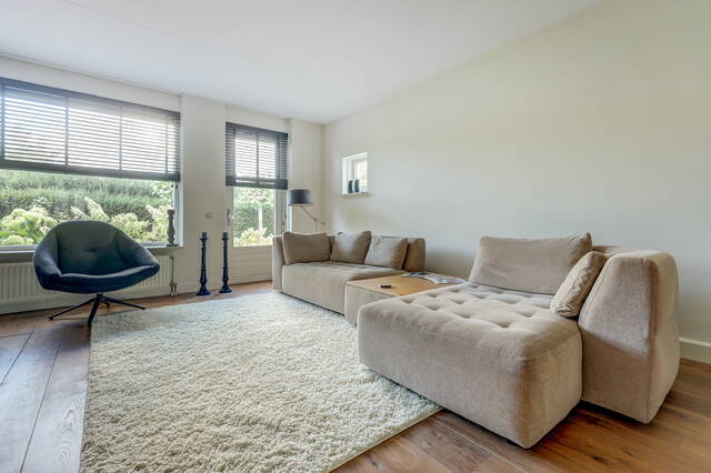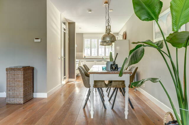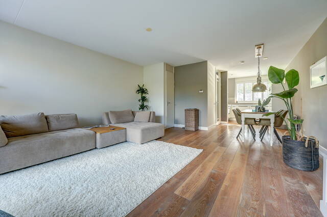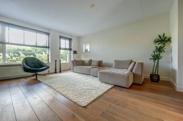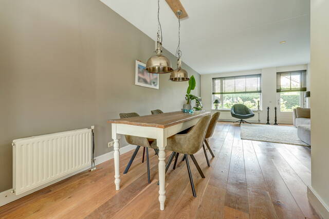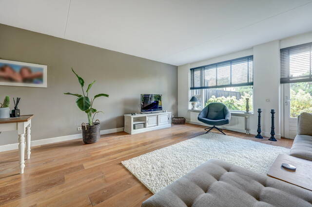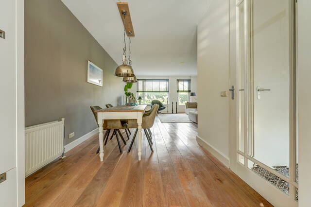 Via de verzorgde voortuin komt u binnen in de ruime hal met garderobe, toiletruimte en trapopgang. Vanuit de hal stapt u via de glazen paneeldeur de lichte woonkamer binnen: een sfeervolle leefruimte met een fraaie houten vloer, grote ramen en neutrale kleuren. De woonkamer (ca. 33 m²) biedt voldoende ruimte voor een comfortabele zithoek en een royale eettafel, ideaal voor gezellige avonden met familie of vrienden.