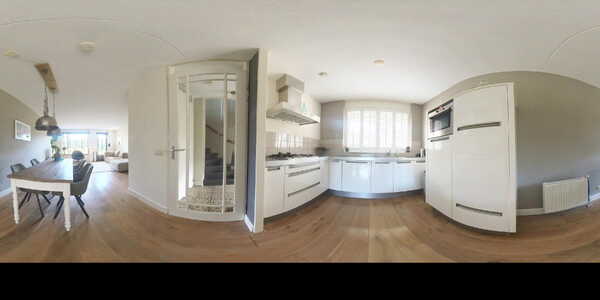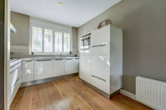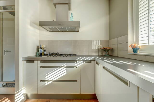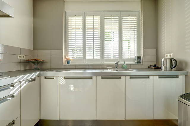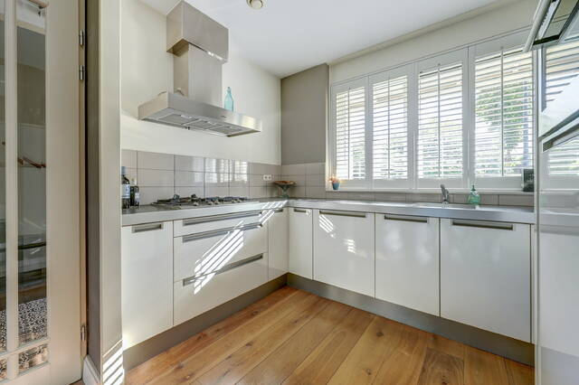 Aan de voorzijde bevindt zich de moderne open keuken (ca. 9 m²), uitgevoerd in een lichte kleurstelling met hoogglans fronten en een strak werkblad. De keuken is voorzien van een 5 pits gaskookplaat, RVS afzuigkap, combi oven, vaatwasser en koelkast. Dankzij de grote ramen met shutters is er veel natuurlijke lichtinval, wat zorgt voor een frisse, open uitstraling.