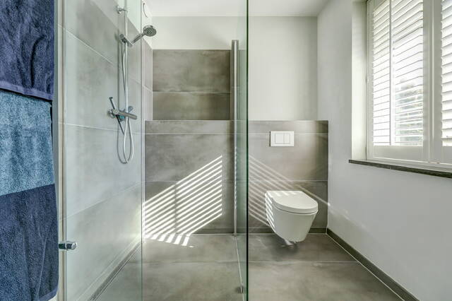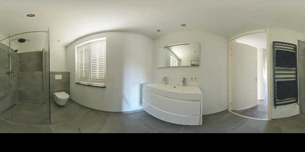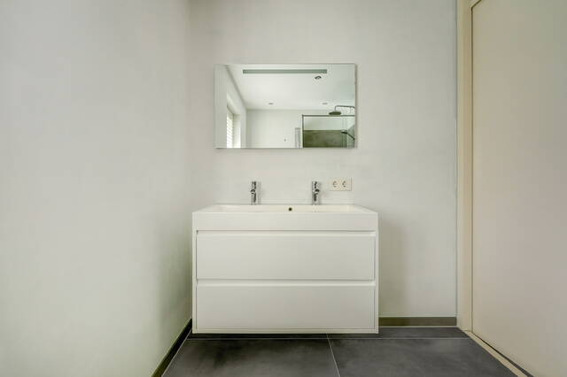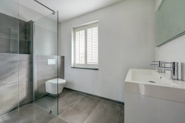 De badkamer (ca. 6 m²) is strak en modern afgewerkt met grote grijze tegels en glad stucwerk, een inloopdouche, een hangend toilet en een dubbel wastafelmeubel met verlichte en verwarmde spiegel.