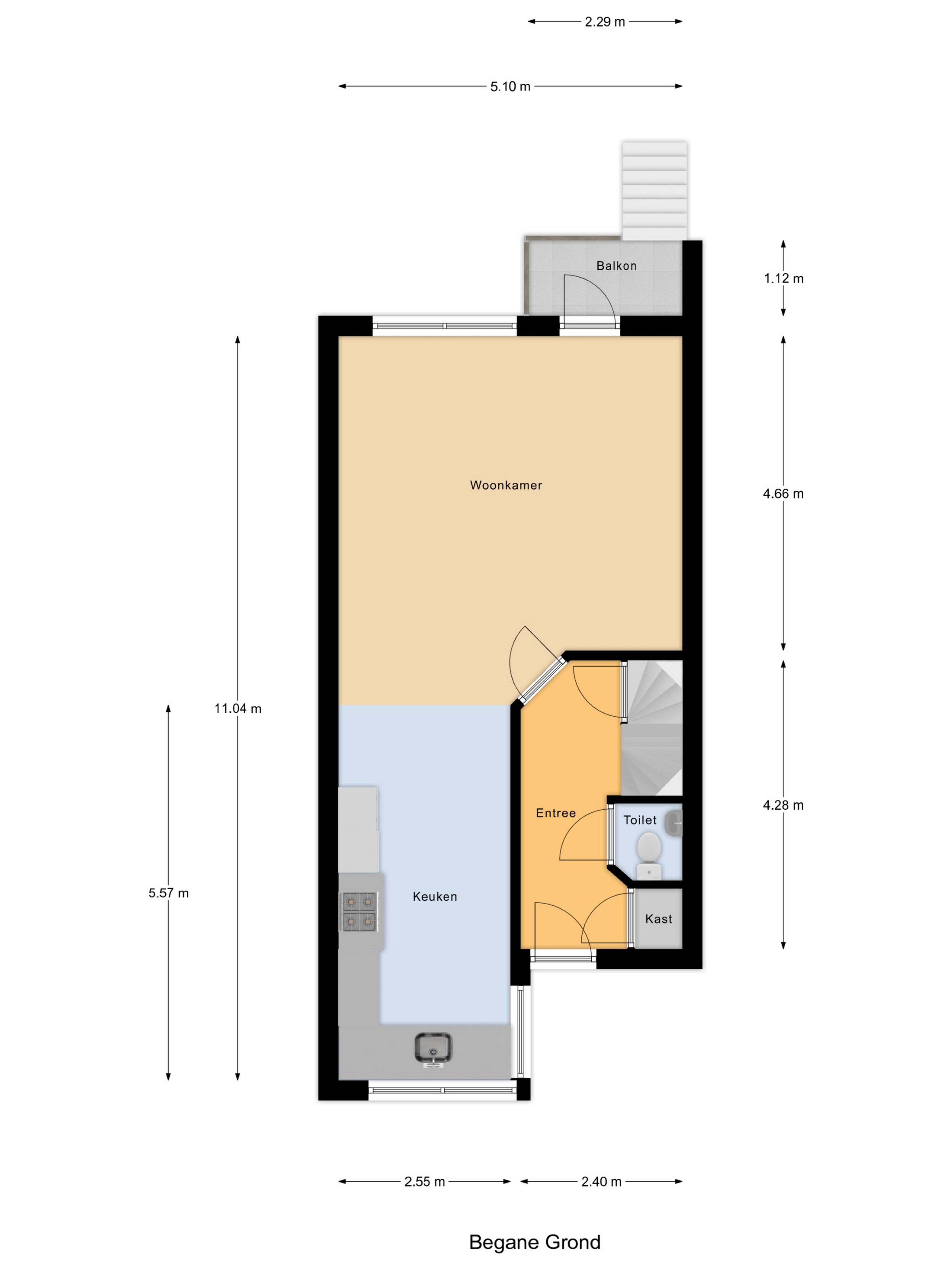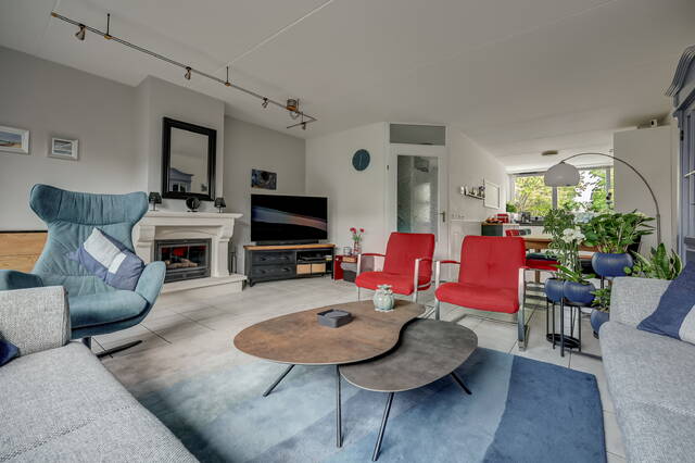 Via de trap aan de voorzijde bereik je de entree op de verhoogde begane grond. De hal biedt toegang tot het toilet, de meterkast en de trap naar boven en naar het souterrain. Vanuit de hal stap je de ruime woonkamer (ca. 26 m²) binnen, die dankzij de grote ramen veel lichtinval heeft. De woonkamer heeft een sfeervolle openhaard met een fraaie kalkzandstenen schouw. Aan de achterzijde bevindt zich het balkon, met de trap naar de achtertuin