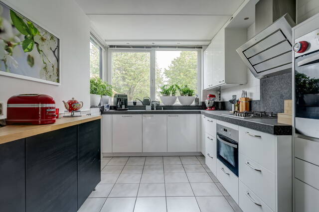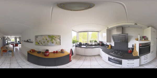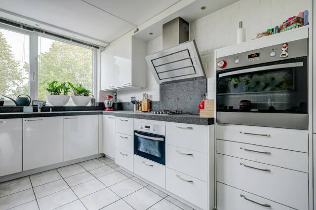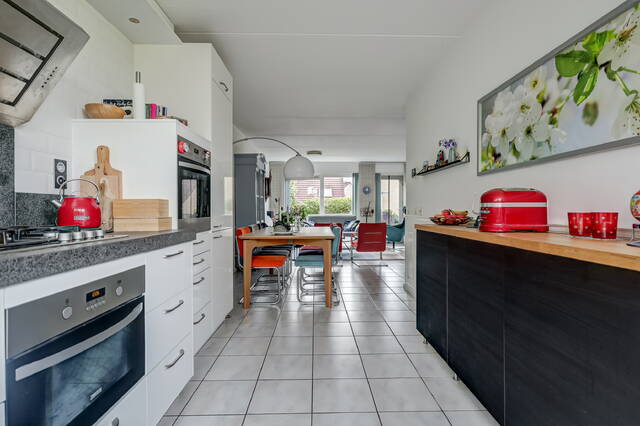De open keuken (ca. 14 m²) is gelegen aan de voorzijde en is modern en praktisch ingericht. Uitgevoerd in hoogglans wit met een grijs natuurstenen aanrechtblad en diverse inbouwapparatuur zoals een gaskookplaat, oven, combimagnetron, RVS afzuigkap, koel/vries combinatie en een vaatwasser. De hoekopstelling met de Lemans carrousel kast en het extra werkblad op het vrijstaande blok aan de andere zijde bieden veel kastruimte en werkcomfort. De keuken is bovendien heerlijk licht dankzij de grote raampartijen.