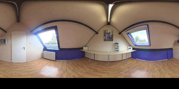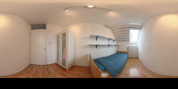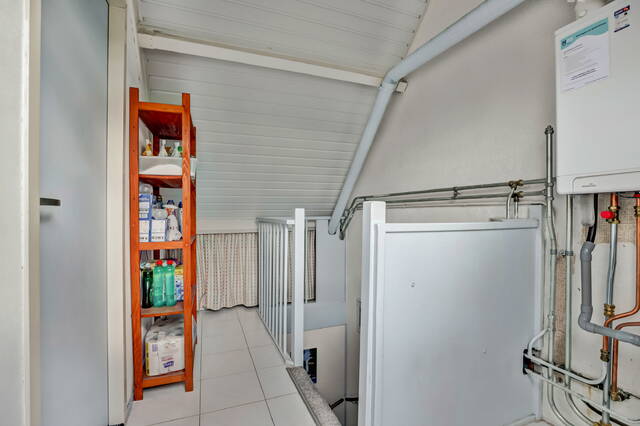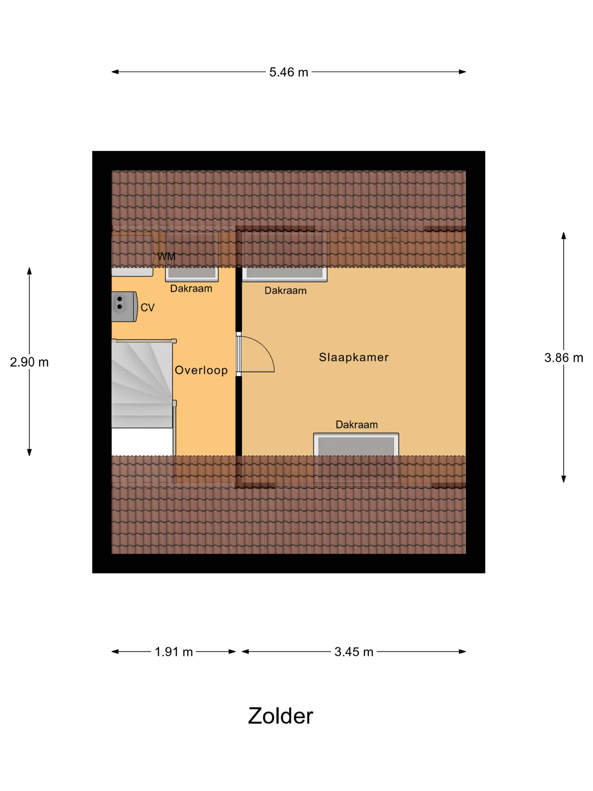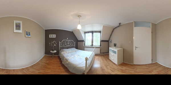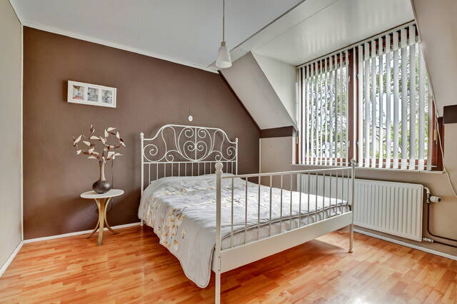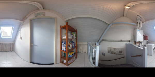 Met de trap loop je naar de tweede verdieping. Op de overloop is bergruimte onder de schuine kap en vind je de aansluitingen voor wasmachine en droger, evenals de cv-installatie (Intergas HRE, 2025). Achter de deur ligt de vierde slaapkamer van ruim 10 m², met zowel een dakraam aan de voor- als achterzijde en extra bergruimte achter de knieschotten.
