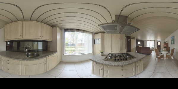 Terug in de woonkamer stap je aan de voorzijde de open keuken in: een nette keuken voorzien van diverse inbouwapparatuur. Je kookt op het kookeiland op gas en beschikt daarnaast over een vaatwasser, koelkast, vriezer en een spoelbak met mengkraan. Er is lekker veel bergruimte in alle kasten – zowel grote hoge kasten als laden en onderkastjes – dus meer dan genoeg plek voor servies en keukenspullen. Door het grote raam aan de voorzijde komt heerlijk veel licht binnen en kijk je prettig weg over het groen, de stoep en het fietspad.