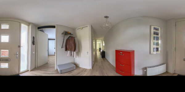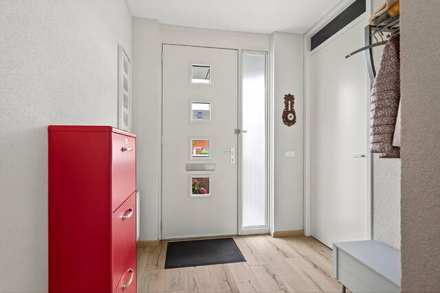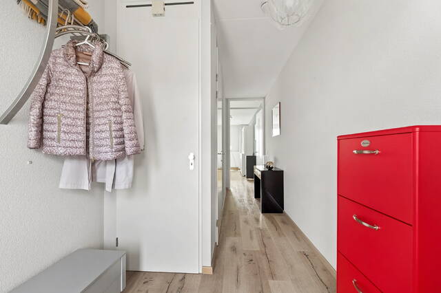 Via een klein trapje bereikt u de eigen entree van het appartement direct vanaf de parkeerplaats. In de hal bevindt zich de meterkast, ruimte voor de garderobe en toegang tot vrijwel alle vertrekken.