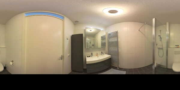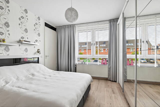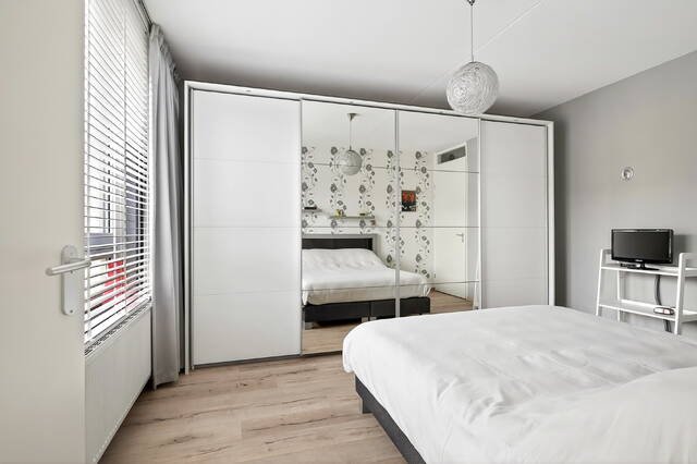De slaapkamer is praktisch ingedeeld, voorzien van een vaste schuifkastenwand en biedt toegang tot de badkamer. Deze badkamer is geheel betegeld in een stijlvolle wit/grijze kleurstelling en uitgerust met een inloopdouchecabine, hangend toilet, dubbel wastafelmeubel met spiegelkast en een aparte bergkast, strak, fris en modern.