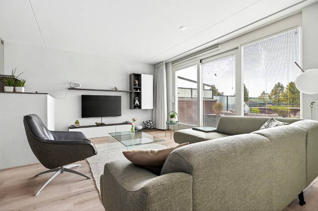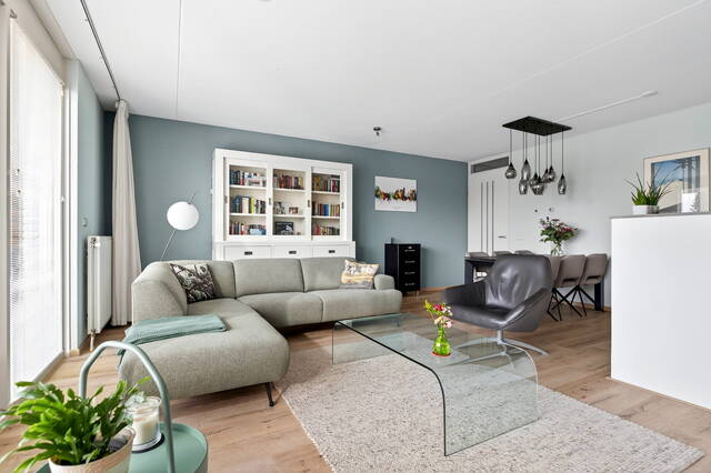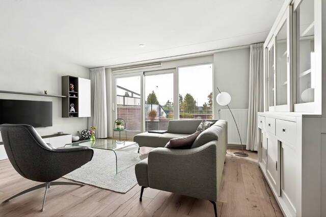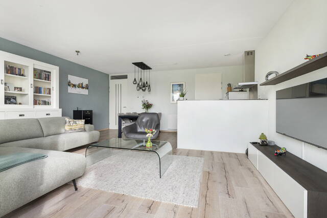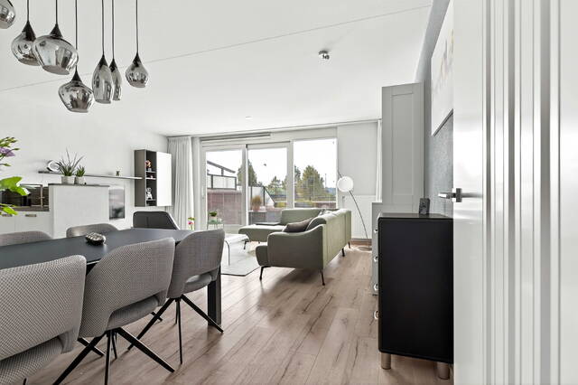 De woonkamer is te betreden via een moderne paneeldeur en biedt direct een gevoel van ruimte en licht. De grote schuifpui aan de achterzijde zorgt voor een prachtige lichtinval en geeft toegang tot het royale dakterras.