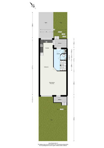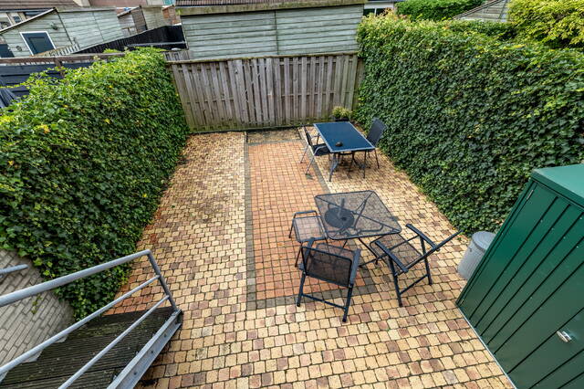 De achtertuin is verzorgd aangelegd en grotendeels bestraat. Dankzij het aanwezige zonnescherm en de gunstige ligging kun je hier op elk moment van de dag comfortabel buiten zitten. De tuin is via de woonkamer bereikbaar en biedt veel privacy.