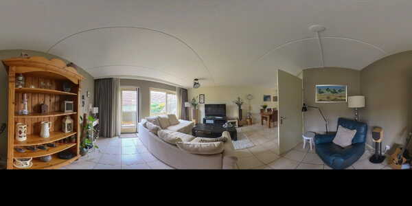 De lichte woonkamer aan de achterzijde biedt veel ruimte en prettig uitzicht op de tuin. Dankzij de grote raampartijen komt er veel daglicht binnen. Via een deur en trap is de achtertuin bereikbaar, voorzien van nette bestrating en een zonnescherm – een fijne plek om te ontspannen.