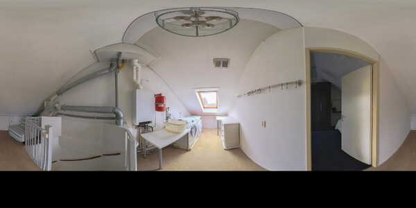 De tweede verdieping is bereikbaar via een vaste trap en biedt een ruime voorzolder met aansluitingen voor wasmachine en droger, bergruimte achter de knieschotten en de opstelplaats van de CV-combiketel.