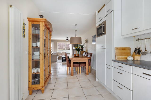 Aan de voorzijde ligt de open keuken in hoekopstelling, uitgerust met diverse inbouwapparatuur zoals een vaatwasser, afzuigkap, gaskookplaat, heteluchtoven, koelkast en magnetron. De keuken biedt vrij uitzicht aan de voorzijde en een praktische indeling.