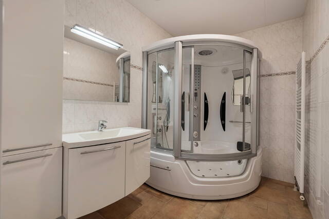 Badkamer (ca. 6 m2) met sanitaire voorzieningen zoals een wastafel met wastafelmeubel, spiegel, verlichting, een extra vaste kast voor de handdoeken en een douchecabine. De badkamer is geheel betegeld in een lichte kleurstelling.