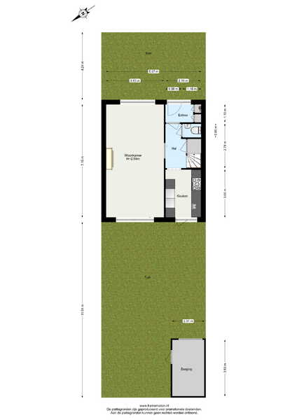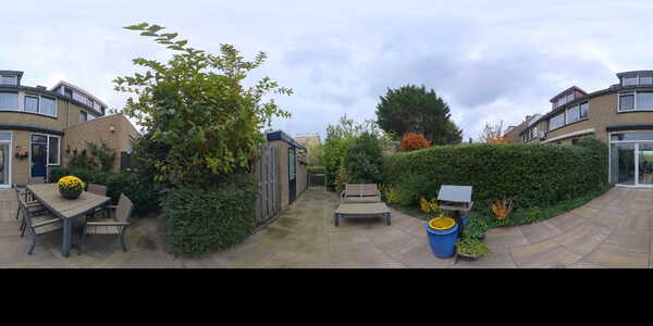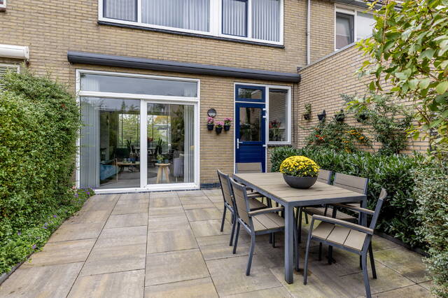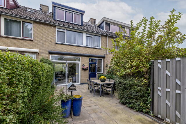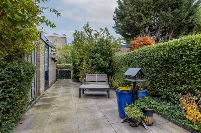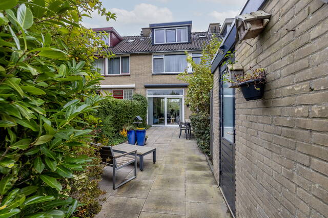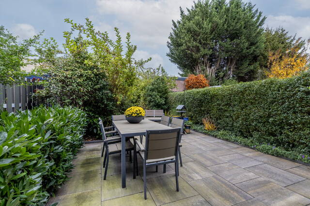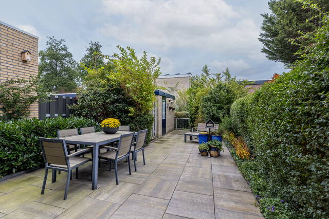 De achtertuin op het westen biedt veel privacy en groen. Hier geniet je volop van de middag- en avondzon. De tuin beschikt over een achterom, een elektrisch bedienbaar zonnescherm en een vrijstaande stenen berging voor fietsen en tuinspullen.