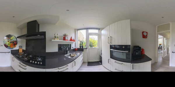 De keuken, bereikbaar vanuit de hal, heeft twee rechte opstellingen in een rustige beige tint met een zwart composiet aanrechtblad. Alle inbouwapparatuur is aanwezig: combi-magnetron, koel-vriescombinatie, 5-pits gaskookplaat en afzuigkap. Via de loopdeur is er directe toegang tot de tuin.