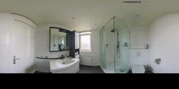 De badkamer is modern uitgevoerd met wit/antraciete betegeling en voorzien van een inloopdouche met glazen wand, een tweede hangend toilet, een wastafelmeubel en een spiegelkast.
