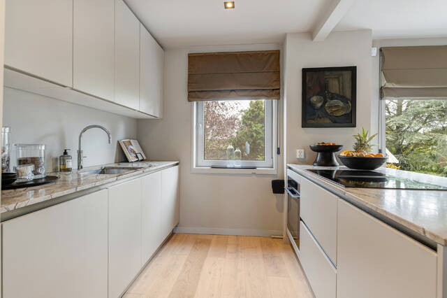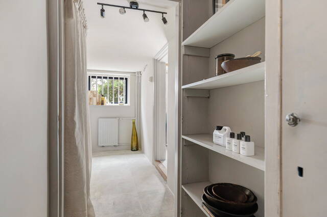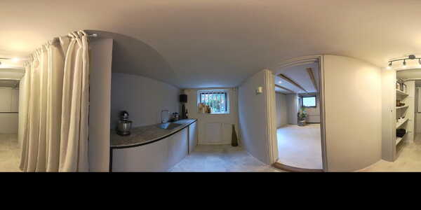 Het onderhuis is praktisch en stijlvol ingericht met een nieuwe keuken voorzien van hetzelfde marmeren aanrechtblad als op de woonverdieping. Er is een handige kast voor wasmachine en droger plus extra bergkast. Deze ruimte is ideaal als hobbyruimte, werkplek of tweede leefruimte.