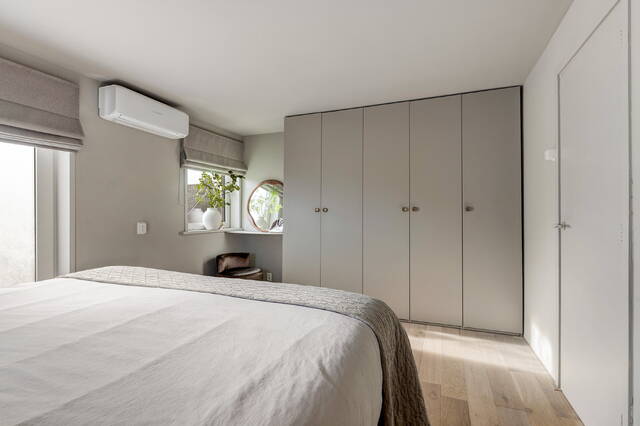 Op de eerste verdieping bevinden zich twee slaapkamers, beide voorzien van eikenhouten vloeren en airconditioning in de ouderslaapkamer. De luxe badkamer is volledig vernieuwd, voorzien van elektrische vloerverwarming, een grote inloopdouche, toilet en marmerlook wastafel met meubel en spiegel – stijlvol én comfortabel.