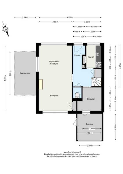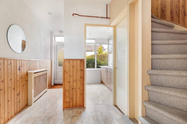U betreedt de woning via de entreehal, waar zich de meterkast, trapkast, lichte toiletruimte met hangend toilet en de trap naar de eerste verdieping bevinden. Vanuit de hal heeft u toegang tot de woonkamer, keuken en bijkeuken.