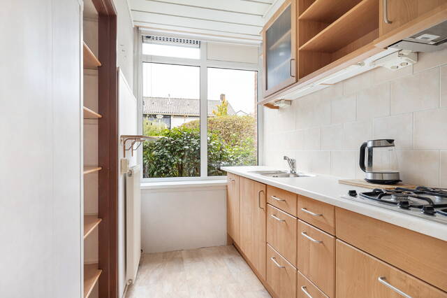 De aparte keuken heeft een rechte opstelling en beschikt over een 4-pits gaskookplaat, smalle vaatwasser en een praktische inbouwkast.