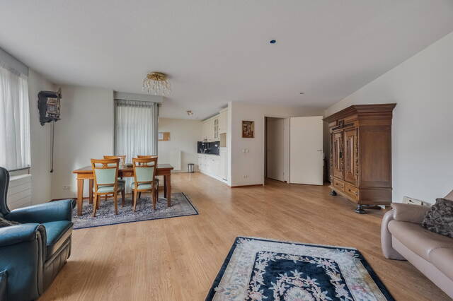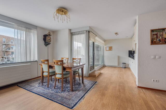 Royale lichte woonkamer voorzien van een laminaatvloer. De grote raampartij zorgt voor volop aangenaam daglicht. De woonkamer biedt verder voldoende ruimte voor een eethoek bij de open keuken.