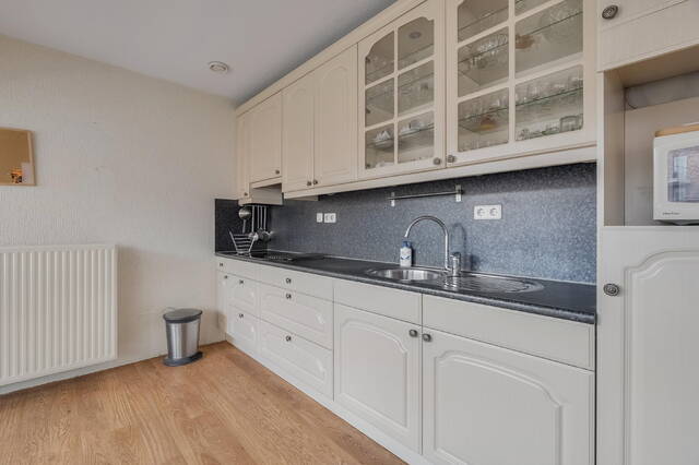De open keuken is uitgevoerd in een L-opstelling en voorzien van diverse inbouwapparatuur zoals een koelkast, vriezer, inductie kookplaat, afzuigkap en een vaatwasser. Verder is de keuken voorzien van een enkele spoelbak en voldoende kastruimte. Het geheel is uitgevoerd in wit en is afgewerkt met een kunststof aanrechtblad, laminaatvloer en verlichting. Door middel van een balkondeur heeft u toegang tot het zonnige balkon.