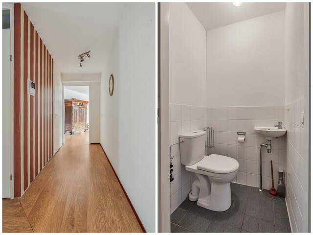 - Badkamer met aparte toiletruimte en aparte was-/bergruimte;