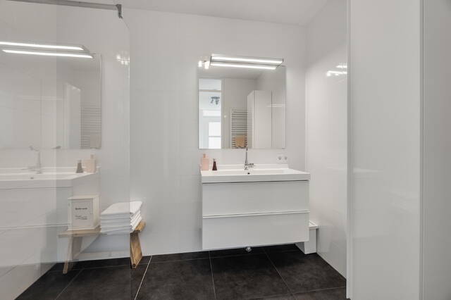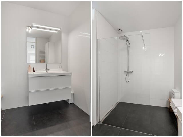 De moderne badkamer is strak afgewerkt met een grote inloopdouche met glazen douchewand, een stijlvol wastafelmeubel en een hoge badkamerkast. Daarnaast is er een separaat toilet, deels betegeld in wit/grijs.