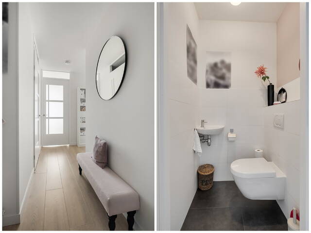 Zodra je de woning binnenstapt, ervaar je de royale ruimte en het lichte karakter. De ruime woonkamer is voorzien van een lichte eiken Quickstep-laminaatvloer. De grote raampartijen zorgen voor een overvloed aan daglicht en een prachtig uitzicht over het groene landschap van de Zuidpolder.