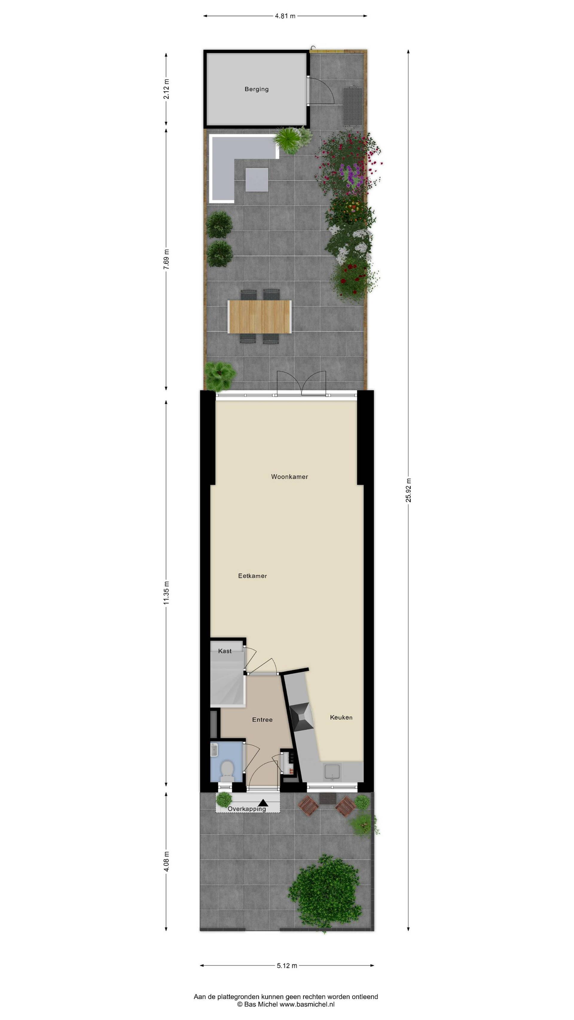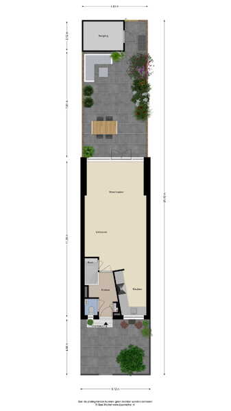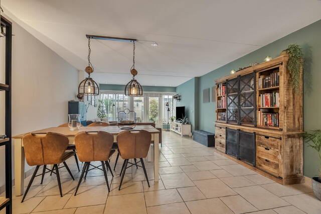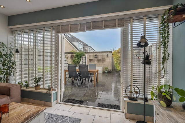 Uitgebouwde tuingerichte woonkamer (ca. 36 m2) voorzien van een lichte tegelvloer met vloerverwarming en grote raampartijen die zorgen voor een aangename, lichte leefruimte. De vloerverwarming op de begane grond zorgt bovendien voor een aangenaam binnenklimaat, het hele jaar door. De woonkamer is verder voorzien van een trap-/voorraadkast. Middels openslaande deuren heeft u toegang tot de achtertuin. Met de openslaande deuren open vloeien binnen en buiten letterlijk in elkaar over.