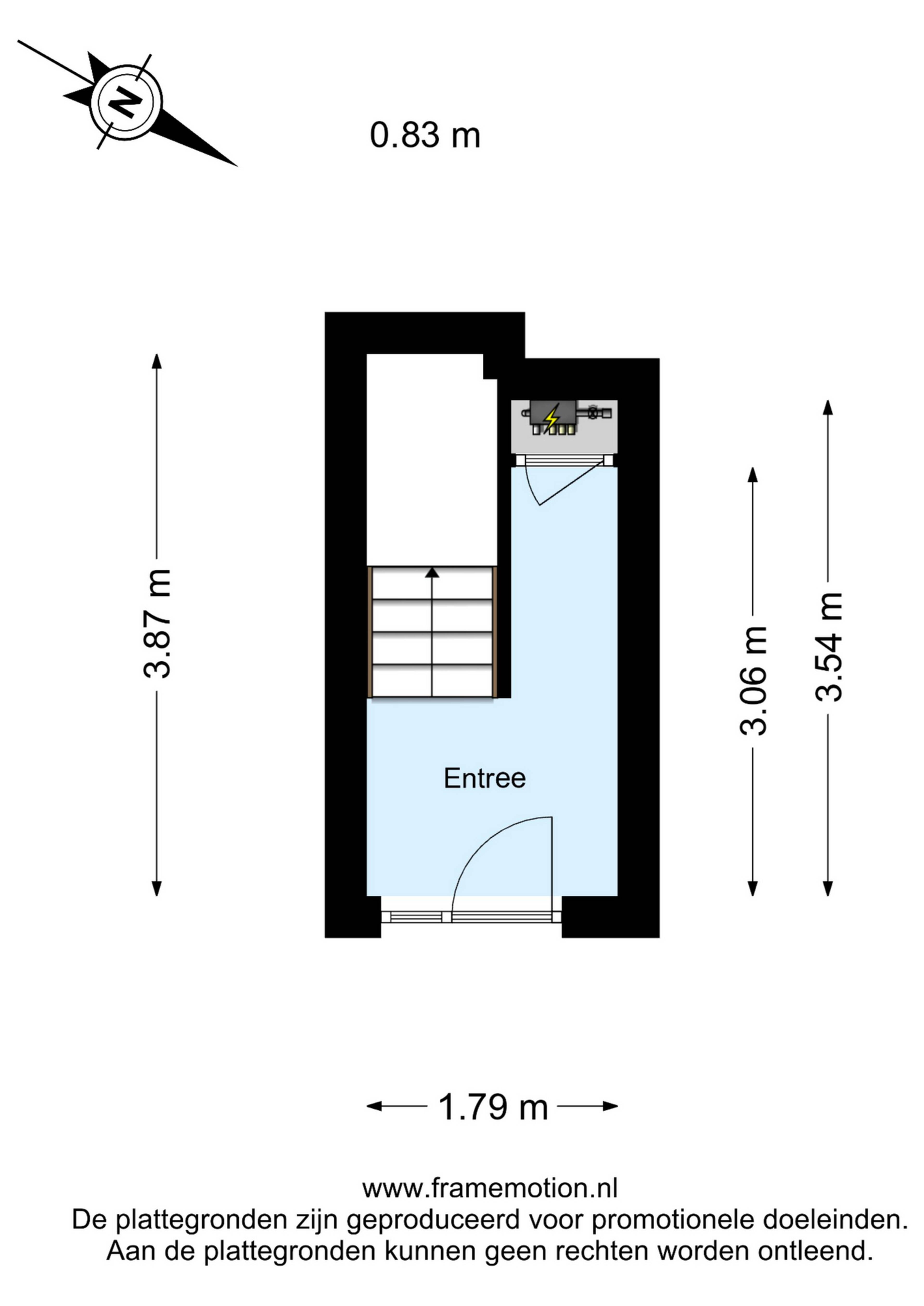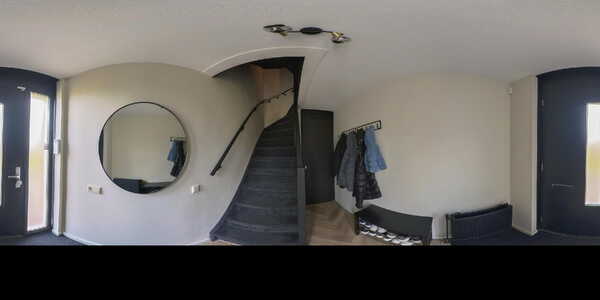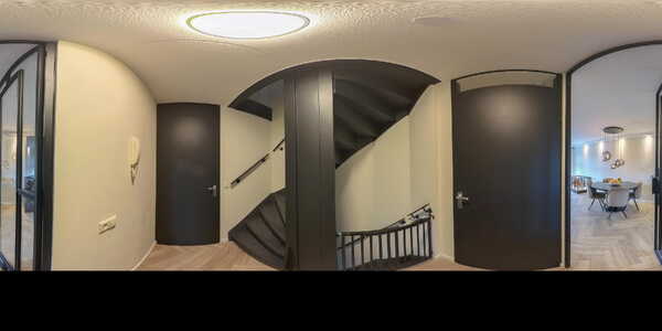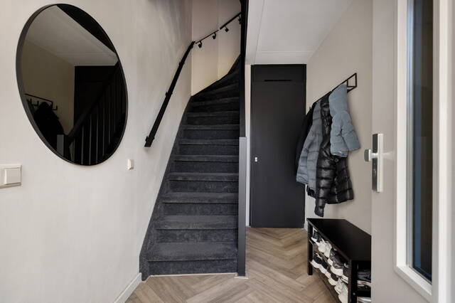Entree in de hal met meterkast en praktische berguimte onder de trap. Hier bevindt zich de trapopgang naar de eerste verdieping.