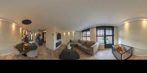Via een stijlvolle zwarte stalen deur kom je in de lichte woonkamer.