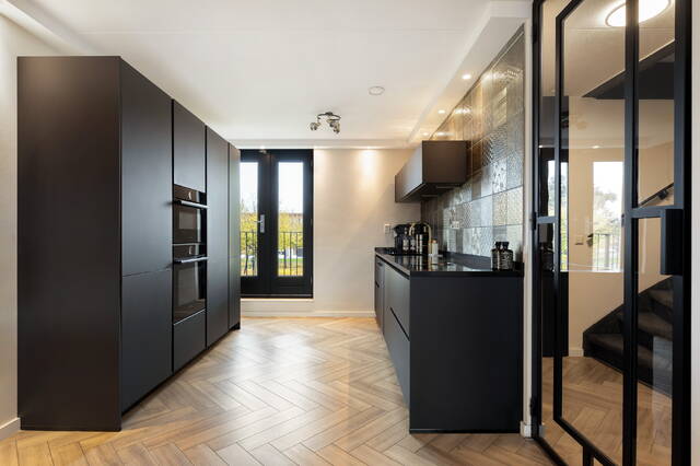 Luxe zwarte keuken met natuurstenen blad en hoogwaardige apparatuur