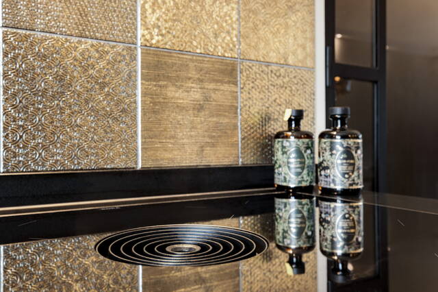 Goudkleurige Quooker in de keuken en stijlvolle gouden details in het toilet