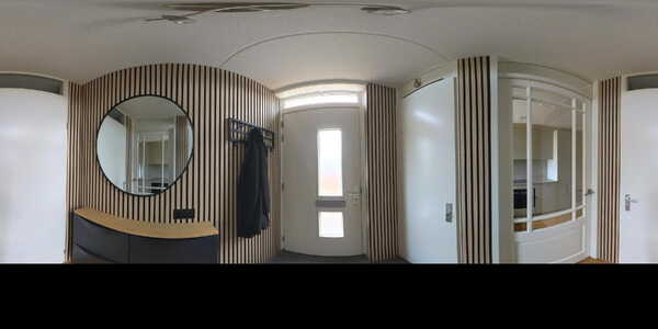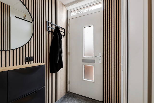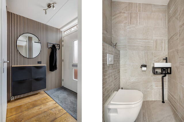 Via de entree komt u binnen in de moderne hal, fraai afgewerkt met akoestische wandpanelen. Hier bevindt zich het in 2024 vernieuwde toilet, uitgevoerd met een hangend toilet en fonteintje en geheel betegeld in een stijlvolle beige kleurstelling.