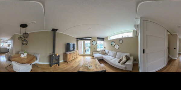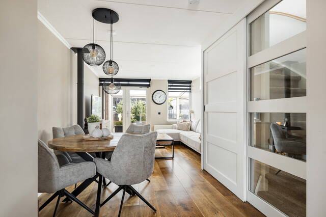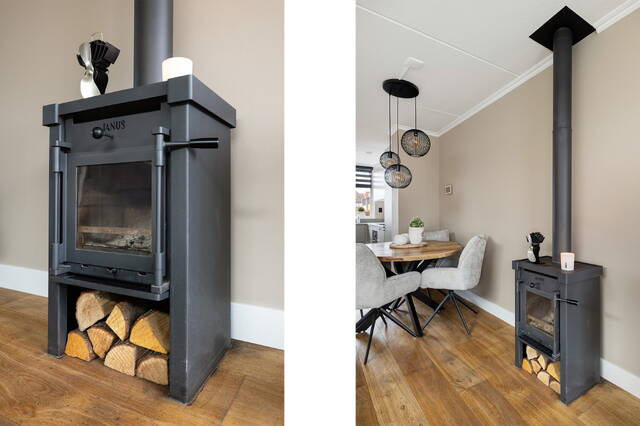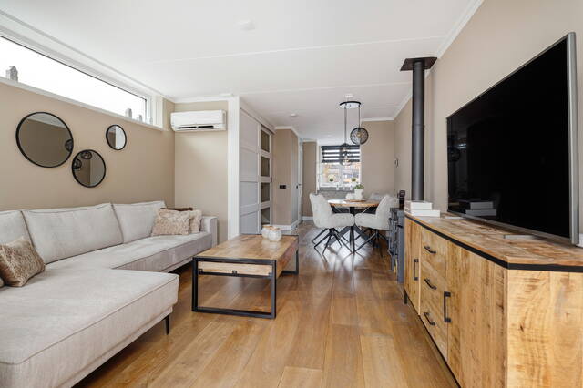 De begane grond is voorzien van een houten vloer en biedt een warme, huiselijke uitstraling. In de woonkamer zorgt een vrijstaande houtkachel voor extra sfeer en comfort, terwijl de aanwezige airconditioning bijdraagt aan een aangenaam binnenklimaat in alle seizoenen. De trap en trapkast zijn netjes afgesloten met fraaie schuifdeuren.