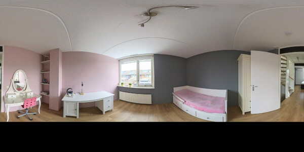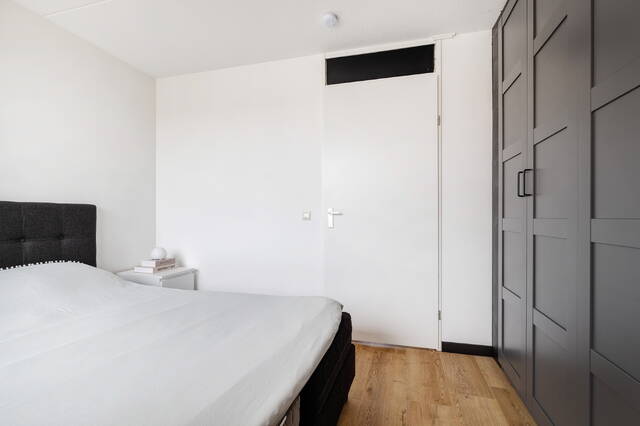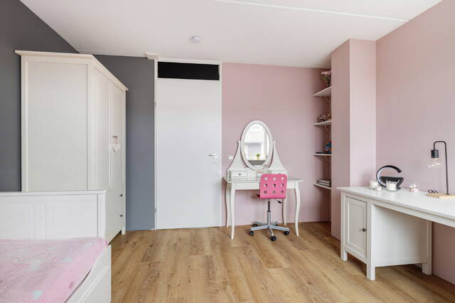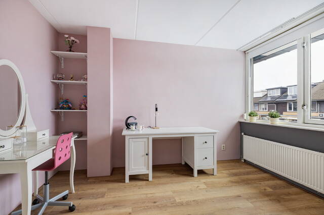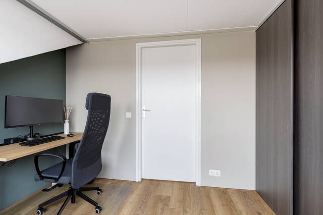 De derde slaapkamer is een volwaardige en prettige ruimte met een vaste schuifkastenwand, een dakkapel aan de achterzijde, een laminaatvloer en glad gestucte wanden. Aan zowel de voor- als achterzijde zijn knieschotten met bergruimte aanwezig, wat zorgt voor extra praktische opbergmogelijkheden.