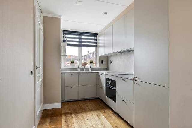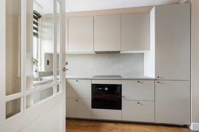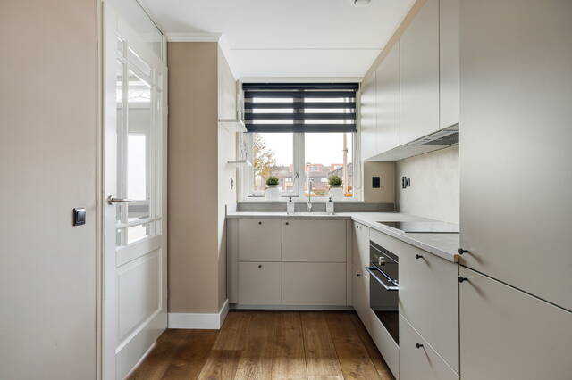 De open keuken is gesitueerd aan de voorzijde en is in 2025 volledig vernieuwd. Uitgevoerd in een moderne beige tint en geplaatst in een praktische hoekopstelling. De keuken is uitgerust met een combi-oven, een 4-pits inductiekookplaat met geïntegreerde afzuiging, een koel-vriescombinatie en veel lades voor optimaal opbergcomfort.