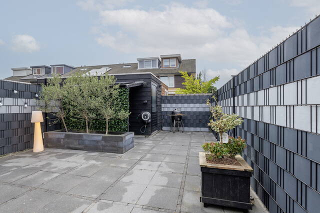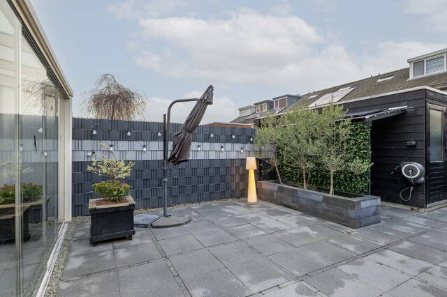 De achtertuin is gelegen op het oosten, netjes aangelegd met bestrating en volledig omheind. Achterin de tuin staat een houten berging met een aangebouwde overkapping, ideaal voor het opslaan van haardhout of het stallen van een scooter of motor. De tuin is tevens bereikbaar via een praktische achterom.