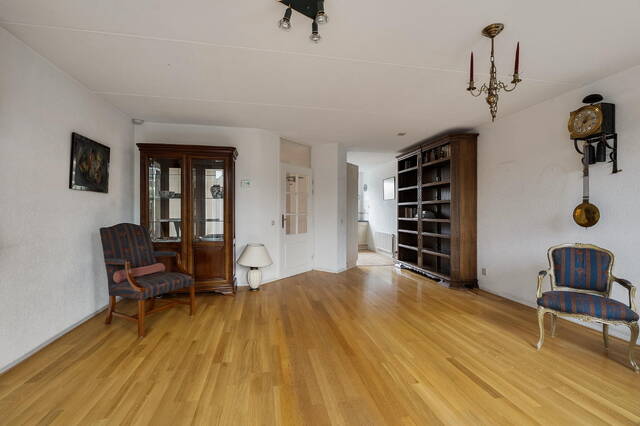 De tuingerichte woonkamer is licht en ruim en beschikt over een duurzame parketvloer. Via de openslaande deuren staat u direct in de achtertuin, wat zorgt voor een prettige verbinding tussen binnen en buiten.
