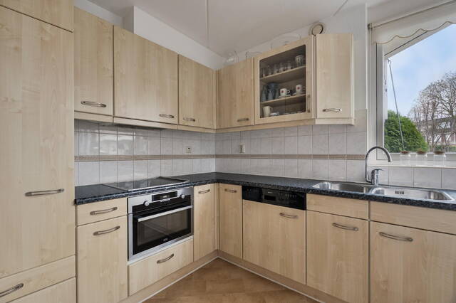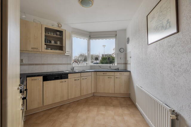 Aan de voorzijde van de woning bevindt zich de royale keuken in hoekopstelling, voorzien van de gebruikelijke inbouwapparatuur. Vanuit de keuken heeft u zicht op de straat.