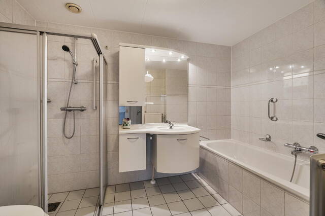 De badkamer op deze verdieping is volledig betegeld in lichte kleuren en uitgerust met een ligbad, douche, toilet en wastafel.