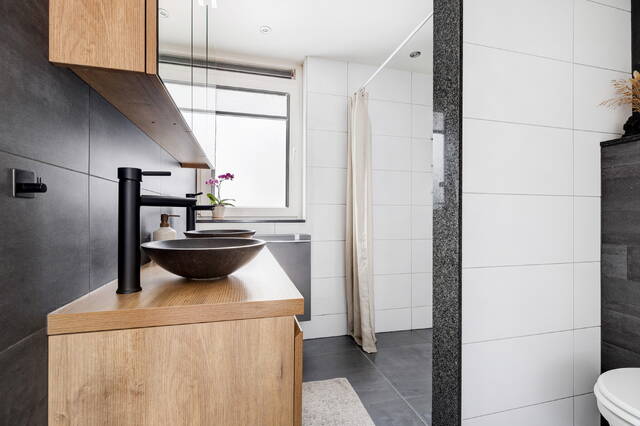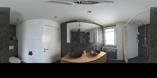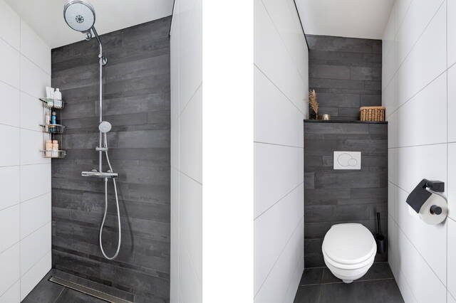 De badkamer is volledig betegeld in grijs-witte tinten en beschikt over een inloopdouche, tweede hangend toilet, stijlvol houten wastafelmeubel met twee waskommen en een brede spiegelkast. Een zwart glazen passende douchewand is aanwezig en indien gewenst kan deze door de koper geplaatst worden.