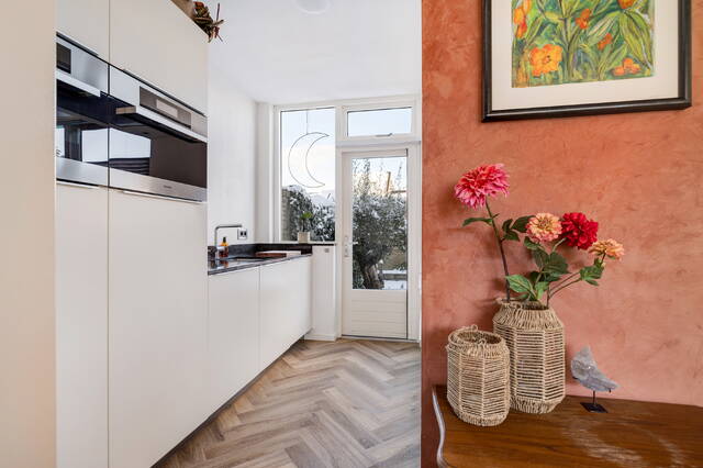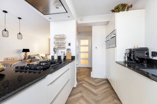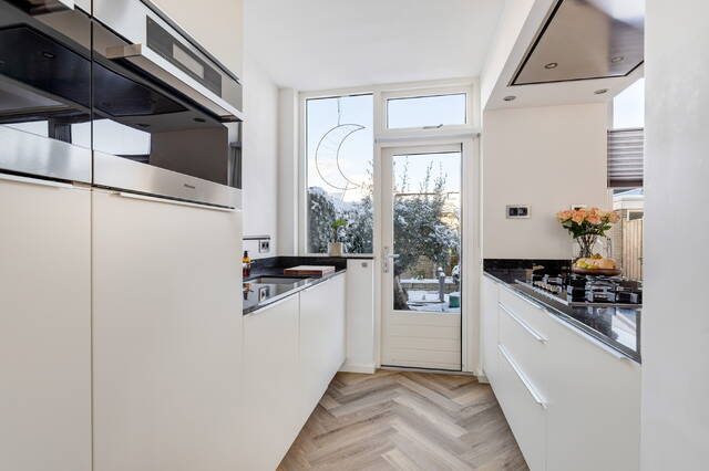 Aan de achterzijde bevindt zich de open keuken in twee rechte opstellingen, uitgevoerd in crème met een donker werkblad. De keuken is voorzien van hoogwaardige Miele-apparatuur (vaatwasser Bosch), een oven, stoomoven, koelkast, vriezer en een 5-pits gaskookplaat met geïntegreerde afzuiging in het plafond. Via een deur met schuifhor loopt u direct de achtertuin in.
