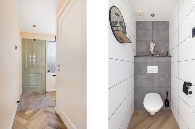 Bij binnenkomst bereikt u de hal met meterkast en nette toiletruimte met hangend toilet en grijze wandtegels. De hal, woonkamer en keuken zijn afgewerkt met een PVC-vloer met vloerverwarming, terwijl wanden en plafonds strak zijn gestuct. Via een paneeldeur loopt u door naar de lichte doorzonwoonkamer met groot raam aan de voorzijde en een schuifpui (met schuifhor) richting achtertuin. Extra bergruimte vindt u in de praktische trapkast. De open trap is afgewerkt met houten traptreden en vormt een stijlvol element in de ruimte.