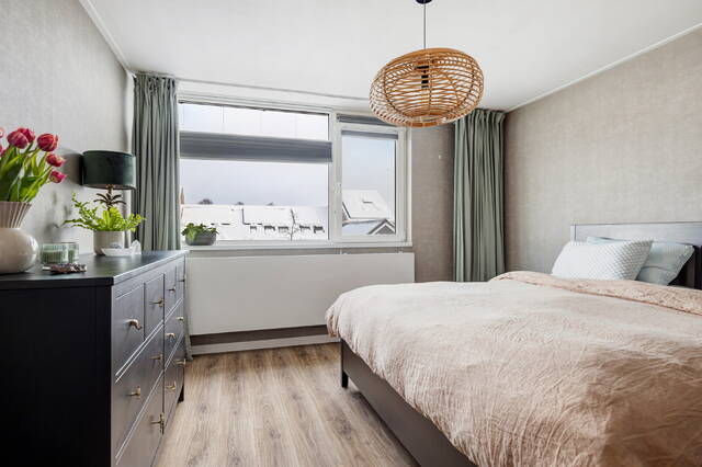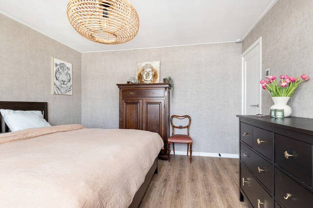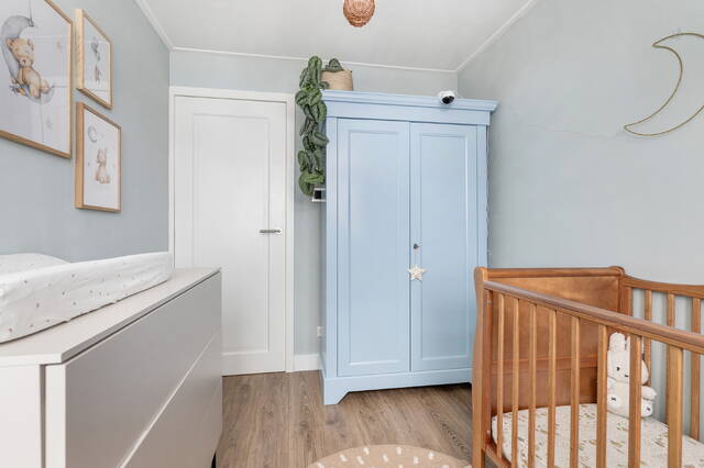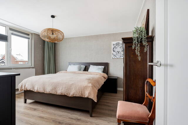 De overloop geeft toegang tot drie slaapkamers — twee aan de achterzijde en één aan de voorzijde — elk voorzien van strak afgewerkte convectorradiatoren en een UTP-aansluiting. De ouderslaapkamer heeft fraai behang; de overige kamers zijn voorzien van glad stucwerk op de wanden. De vloer op deze verdieping is afgewerkt met een laminaatvloer.
