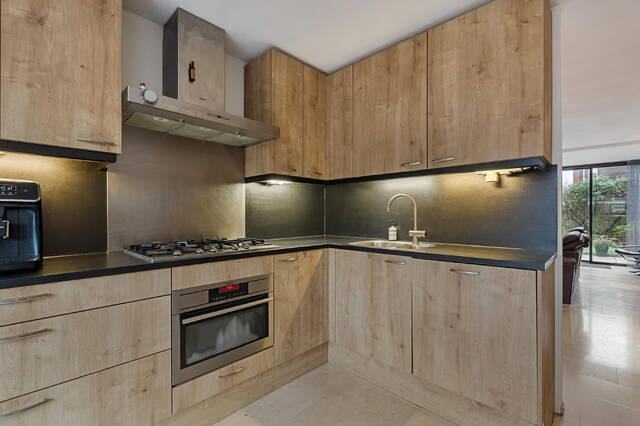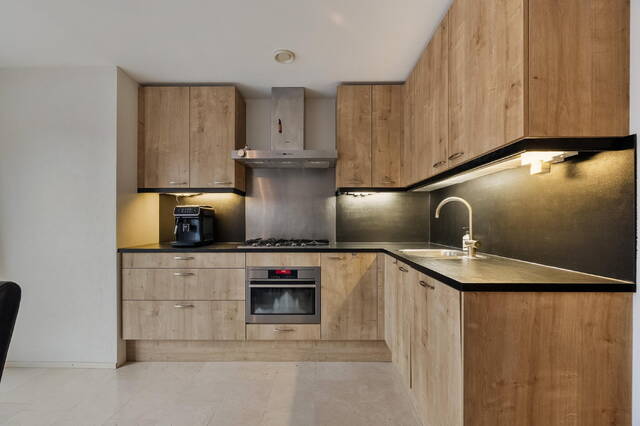 De woning beschikt aan de voorzijde over een nette keuken (ca. 15 m2) met inbouwapparatuur. De keuken is uitgevoerd in een L-opstelling en voorzien van een koelkast, vrieskast, 5-pits gaskookplaat, RVS afzuigkap, combi-ovenmagnetron en een vaatwasser. Tevens is de keuken voorzien van een anderhalve spoelbak en voldoende kastruimte. Het geheel is uitgevoerd in lichte kleuren en afgewerkt met een kunststof aanrechtblad en marmeren tegelvloer met vloerverwarming.